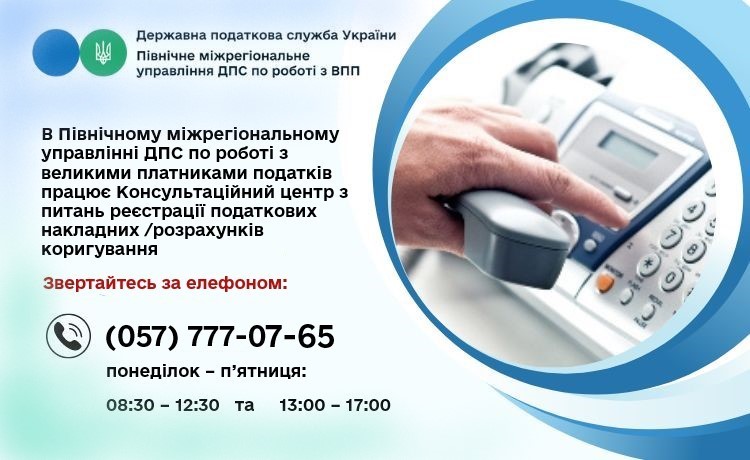 (057) 777-07-65, (050) 275-39-59 (з питань зупинення реєстрації податкової накладної/розрахунку коригування)