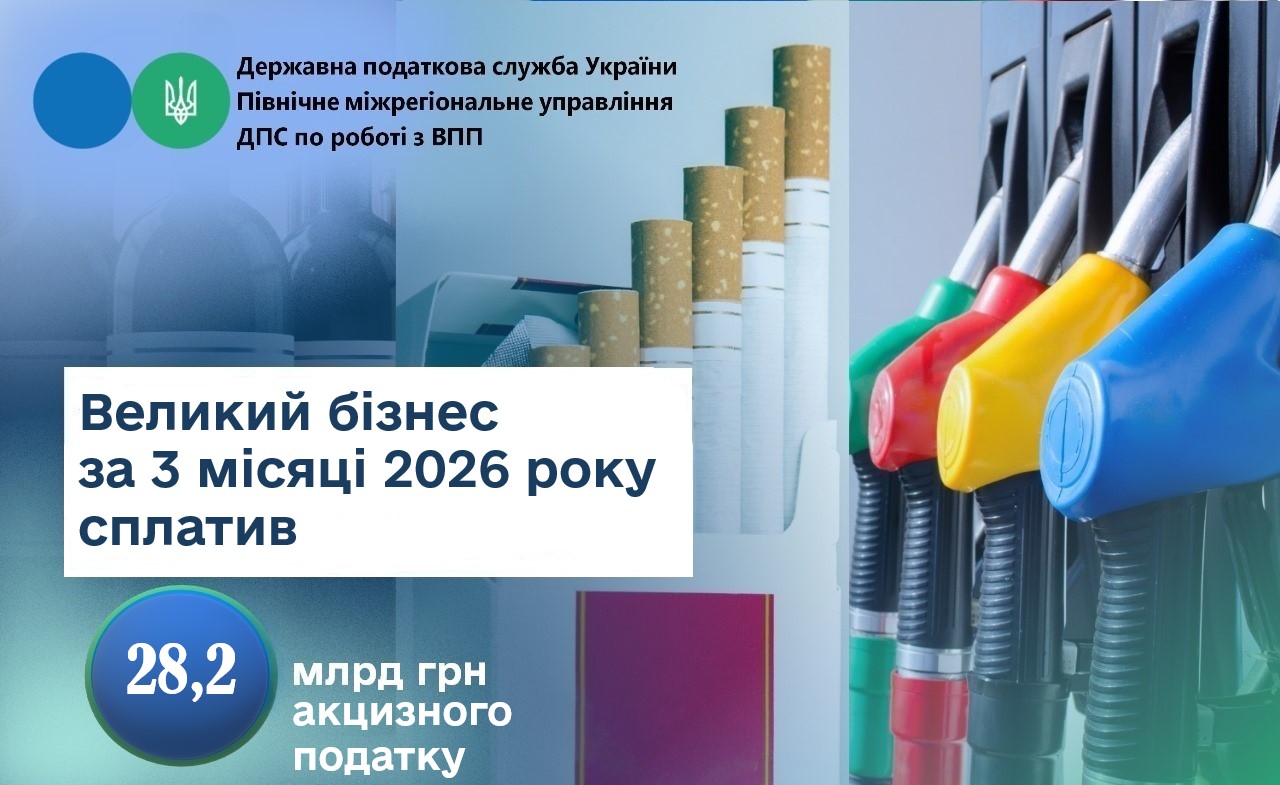 Протягом І кварталу 2026 року від платників, які обслуговуються в Північному міжрегіональному управлінні ДПС по роботі з великими платниками податків, до загального фонду Державного бюджету України надійшло 28,2 млрд гривень акцизного податку з вироблених в Україні та ввезених на митну територію України товарів.