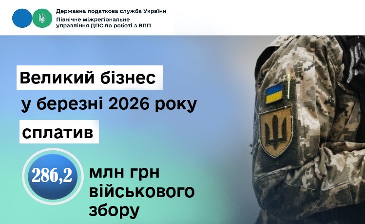 Протягом березня 2026 року платники, які знаходяться на обслуговуванні в Північному міжрегіональному управлінні ДПС по роботі з великими платниками податків, сплатили до бюджету 286,2 мільйони гривень військового збору.