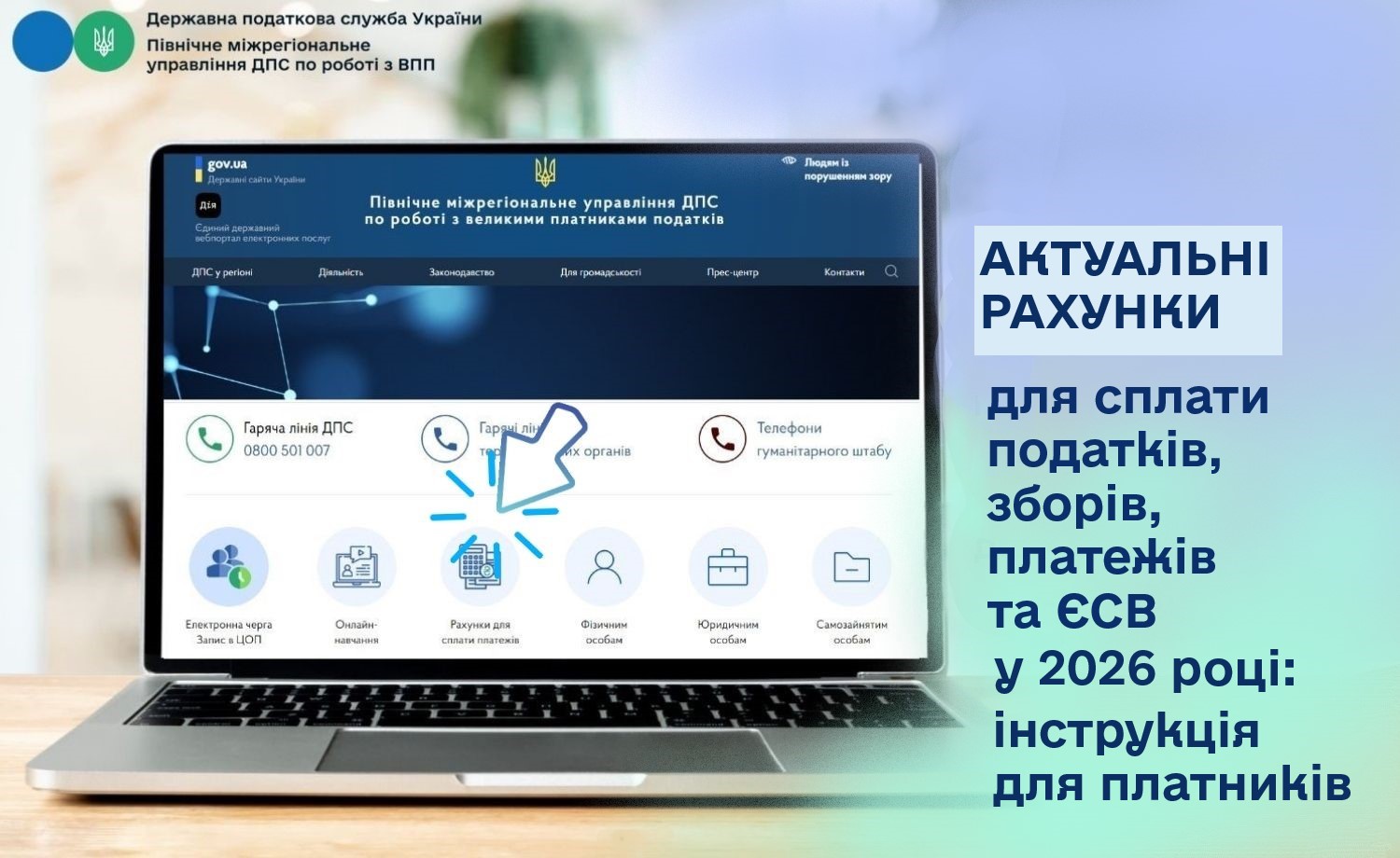 Північне міжрегіональне управління ДПС по роботі з великими платниками податків звертає увагу, що реквізити рахунків для податкових платежів та єдиного внеску на 2026 рік опубліковано на вебпорталі ДПС та субсайтах територіальних органів Служби.