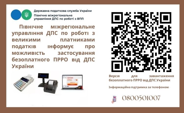 Північне міжрегіональне управління ДПС по роботі з великими платниками податків інформує про можливість застосування безоплатного ПРРО від ДПС України