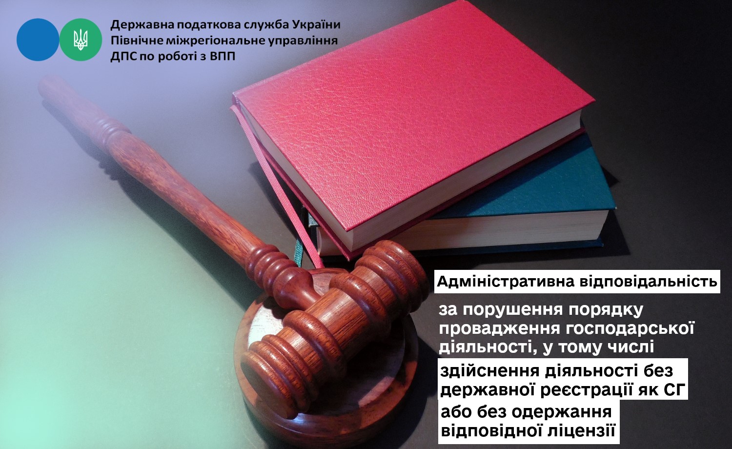 Північне міжрегіональне управління ДПС по роботі з великими платниками податків звертає увагу, що відповідно до ст. 164 Кодексу України про адміністративні правопорушення від 07 грудня 1984 року № 8073-X (далі – КУпАП) встановлено, що провадження господарської діяльності без державної реєстрації як суб’єкта господарювання або без подання повідомлення про початок здійснення господарської діяльності, якщо обов’язковість подання такого повідомлення передбачена законом, або без отримання ліцензії на провадження виду господарської діяльності, що підлягає ліцензуванню відповідно до закону, або у період зупинення дії ліцензії, у разі якщо законодавством не передбачені умови провадження ліцензійної діяльності у період зупинення дії ліцензії, або без одержання документа дозвільного характеру, якщо його одержання передбачене законом (крім випадків застосування принципу мовчазної згоди), –