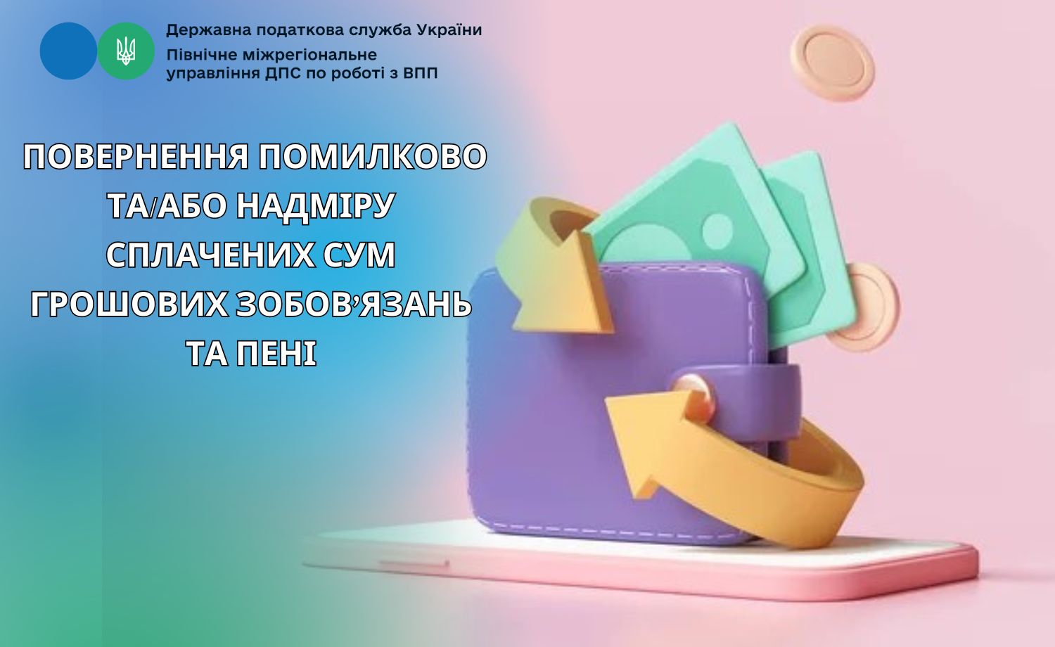 Північне міжрегіональне управління ДПС по роботі з великими платниками податків повідомляє, що повернення помилково та/або надміру сплачених грошових зобов’язань та пені визначено статті 43 Податкового кодексу України від 02 грудня 2010 року № 2755-VІ (далі – ПКУ) та Порядком інформаційної взаємодії Державної податкової служби України, її територіальних органів, Державної казначейської служби України, її територіальних органів, місцевих фінансових органів у процесі повернення (перерахування) платникам податків помилково та/або надміру сплачених сум грошових зобов’язань та пені, затвердженого наказом Міністерства фінансів України від 11.02.2019 № 60, зареєстрованим в Міністерстві юстиції України 08.04.2019 за № 370/33341 (далі – Порядок № 60).