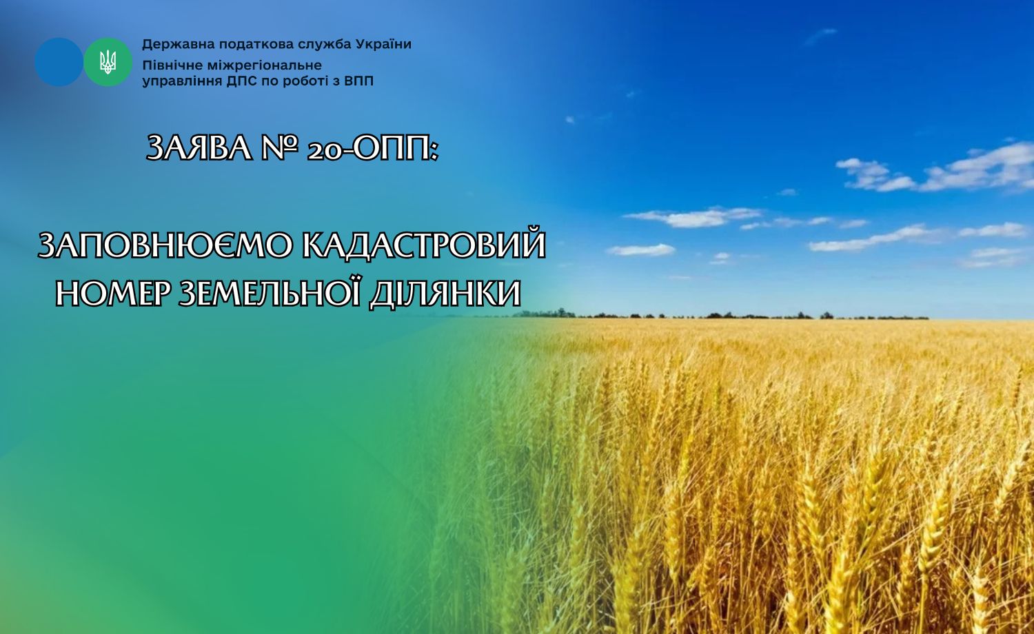 Якщо у платника податків наявна земельна ділянка, про яку він повідомляє контролюючий орган як про об’єкт оподаткування відповідно до вимог п. 63.3 ст. 63 ПКУ, то у графі 17 «Реєстраційний номер об’єкта оподаткування» розд. 3 «Відомості про об’єкти оподаткування платника податків» Заяви за ф. № 20-ОПП має бути зазначений кадастровий номер земельної ділянки, який присвоєний цій земельній ділянці під час її державної реєстрації та занесений до Державного земельного кадастру відповідно до Закону України від 07.07.2011 № 3613-VI «Про державний земельний кадастр» (далі – Закон № 3613).