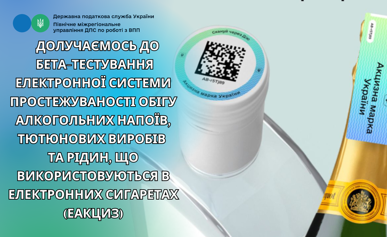 Північне міжрегіональне управління ДПС по роботі з великими платниками податків звертає увагу, що відповідно до п. 2 постанови Кабінету Міністрів України від 4 жовтня 2024 року № 1142 «Деякі питання створення та функціонування Електронної системи обігу алкогольних напоїв, тютюнових виробів та рідин, що використовуються в електронних сигаретах» з 1 березня до 31 грудня 2025 року проводиться випробування функціонування програмного забезпечення Електронної системи обігу алкогольних напоїв, тютюнових виробів та рідин, що використовуються в електронних сигаретах (далі – Електронна система) у тестовому режимі на засадах добровільності, безоплатності, за участю суб’єктів господарювання, які здійснюють виробництво та/або імпорт та/або оптову та/або роздрібну торгівлю товарами (продукцією), маркованими графічними елементами електронних марок акцизного податку.