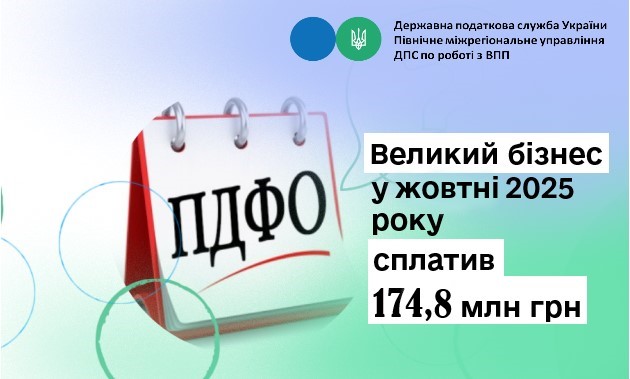 Протягом жовтня 2025 року від підприємств, які знаходяться на податковому обслуговуванні в Північному міжрегіональному управлінні ДПС по роботі з великими платниками податків, до Зведеного бюджету надійшло 174,8 млн гривень податку на доходи фізичних осіб.