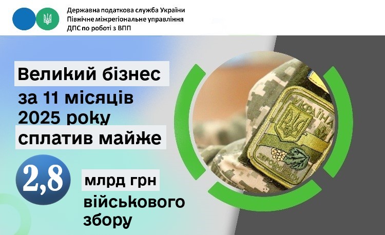 Протягом січня - листопада 2025 року платники, які  знаходяться на обслуговуванні в Північному міжрегіональному управлінні ДПС по роботі з великими платниками податків, сплатили до бюджету майже 2,8 мільярди гривень військового збору.