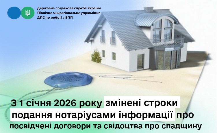 Північне міжрегіональне управління ДПС по роботі з великими платниками податків нагадує, що з 1 січня 2026 року про посвідчені договори та видані свідоцтва про спадщину приватні нотаріуси звітуватимуть щоквартально (з деталізацією по місяцях звітного кварталу), а державні – щомісячно.