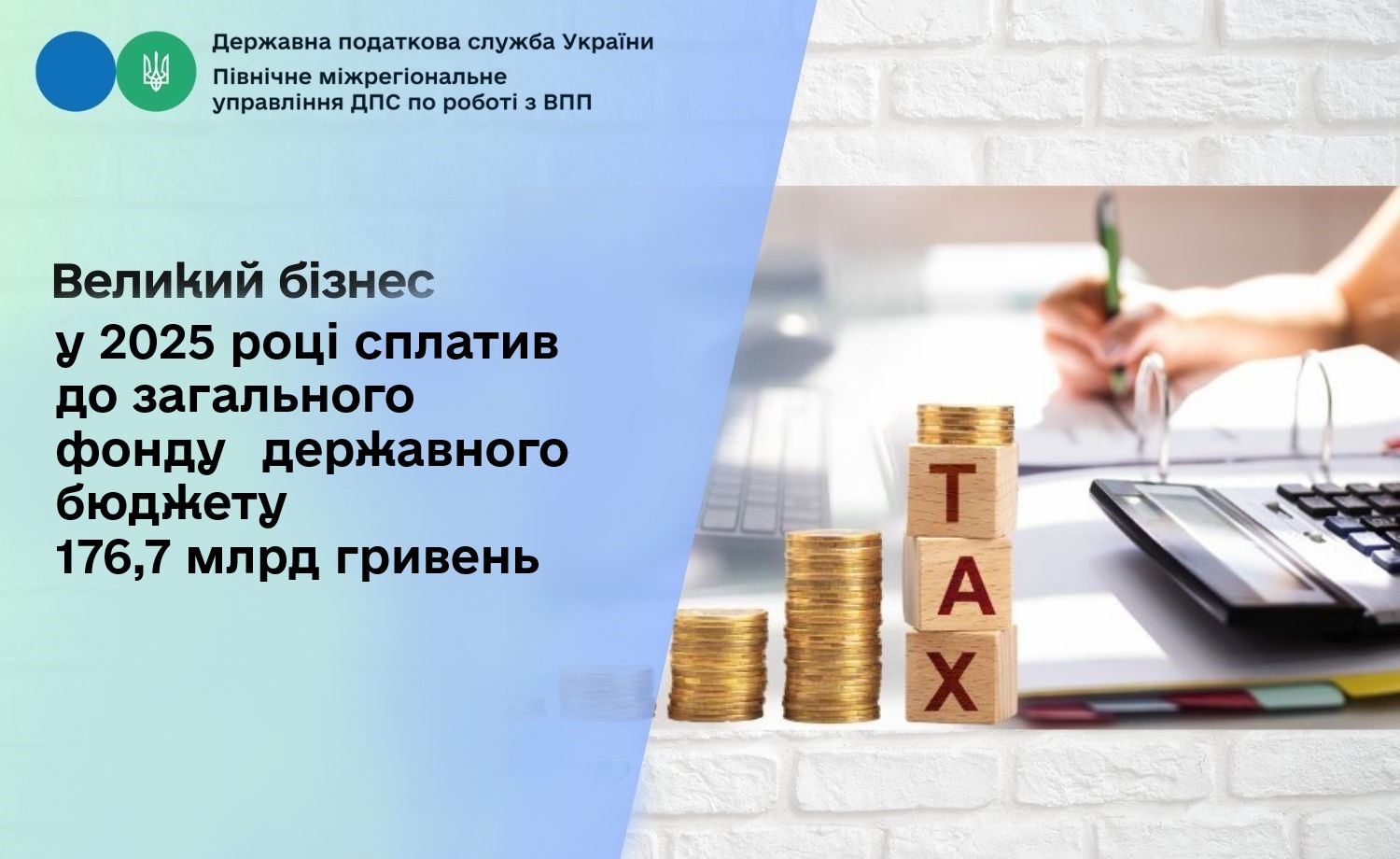 Великі платники продовжують підтримувати економіку України. Кожна гривня, сплачена до бюджету, - це внесок у забезпечення безпеки та стабільності нашої держави. Протягом 2025 року платники Північного міжрегіонального управління ДПС по роботі з великими платниками податків сплатили до загального фонду державного бюджету 176,7 млрд грн.