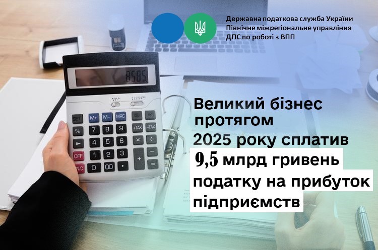 Протягом 2025 року підприємства, які знаходиться на податковому обслуговуванні в Північному міжрегіональному управлінні ДПС по роботі з великими платниками податків, перерахували до бюджетів усіх рівнів 9,5 млрд гривень податку на прибуток підприємств.