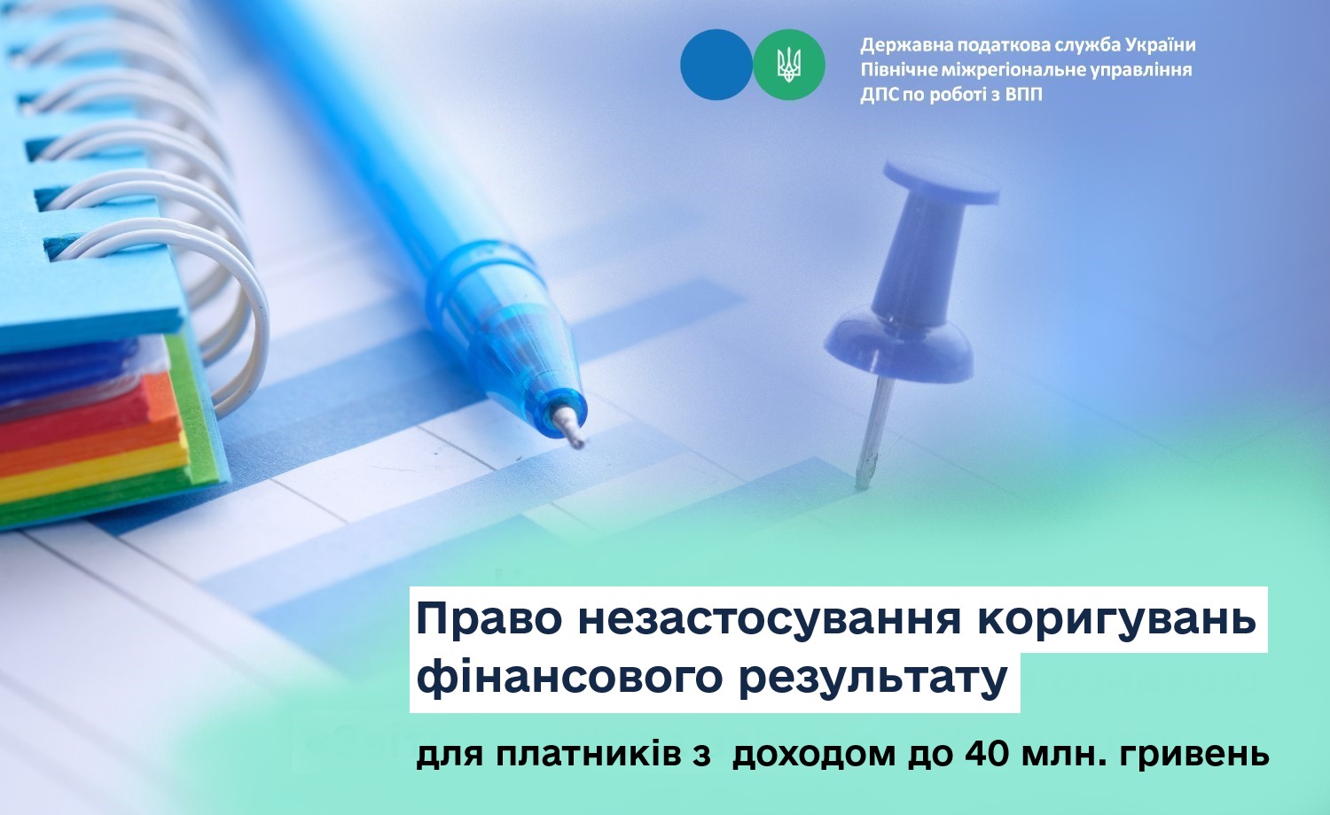 Північне міжрегіональне управління ДПС по роботі з великими платниками податків звертає увагу, що відповідно до абзацу восьмого п.п. 134.1.1 п. 134.1 ст. 134 Податкового кодексу України від 02 грудня 2010 року № 2755-VI (далі – ПКУ) для платників податку, у яких річний дохід від будь-якої діяльності (за вирахуванням непрямих податків), визначений за правилами бухгалтерського обліку, за останній річний звітний період не перевищує 40 млн. грн., об’єкт оподаткування може визначатися без коригування фінансового результату до оподаткування на всі різниці (крім від’ємного значення об’єкта оподаткування минулих податкових (звітних) років та коригувань, визначених п.п. 140.4.8 п. 140.4, п.п. 140.5.16 п. 140.5, п. 140.6 ст. 140 ПКУ), визначені відповідно до положень розд. ІІІ ПКУ. Платник податку, у якого річний дохід (за вирахуванням непрямих податків), визначений за правилами бухгалтерського обліку, за останній річний звітний період не перевищує 40 млн. грн., має право прийняти рішення про незастосування коригування фінансового результату до оподаткування на всі різниці (крім від’ємного значення об’єкта оподаткування минулих податкових (звітних) років та коригувань, визначених п.п. 140.4.8 п. 140.4, п.п. 140.5.16 п. 140.5, п. 140.6 ст. 140 ПКУ), визначені відповідно до положень розд. ІІІ ПКУ, не більше одного разу протягом безперервної сукупності років, у кожному з яких виконується зазначений критерій щодо розміру доходу. Про прийняте рішення платник податку зазначає у податковій звітності з цього податку, що подається за перший рік такої безперервної сукупності років. У подальші роки такої сукупності років коригування фінансового результату також не застосовуються, крім від’ємного значення об’єкта оподаткування минулих податкових (звітних) років та коригувань, визначених п.п. 140.4.8 п. 140.4, п.п. 140.5.16 п. 140.5, п. 140.6 ст. 140 ПКУ.