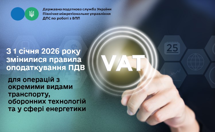 Північне міжрегіональне управління ДПС по роботі з великими платниками податків нагадує, що з початку 2026 року в Україні набули чинності новації з оподаткування ПДВ для низки операцій, що стосуються транспорту, оборонної сфери та відновлення енергетичної інфраструктури.