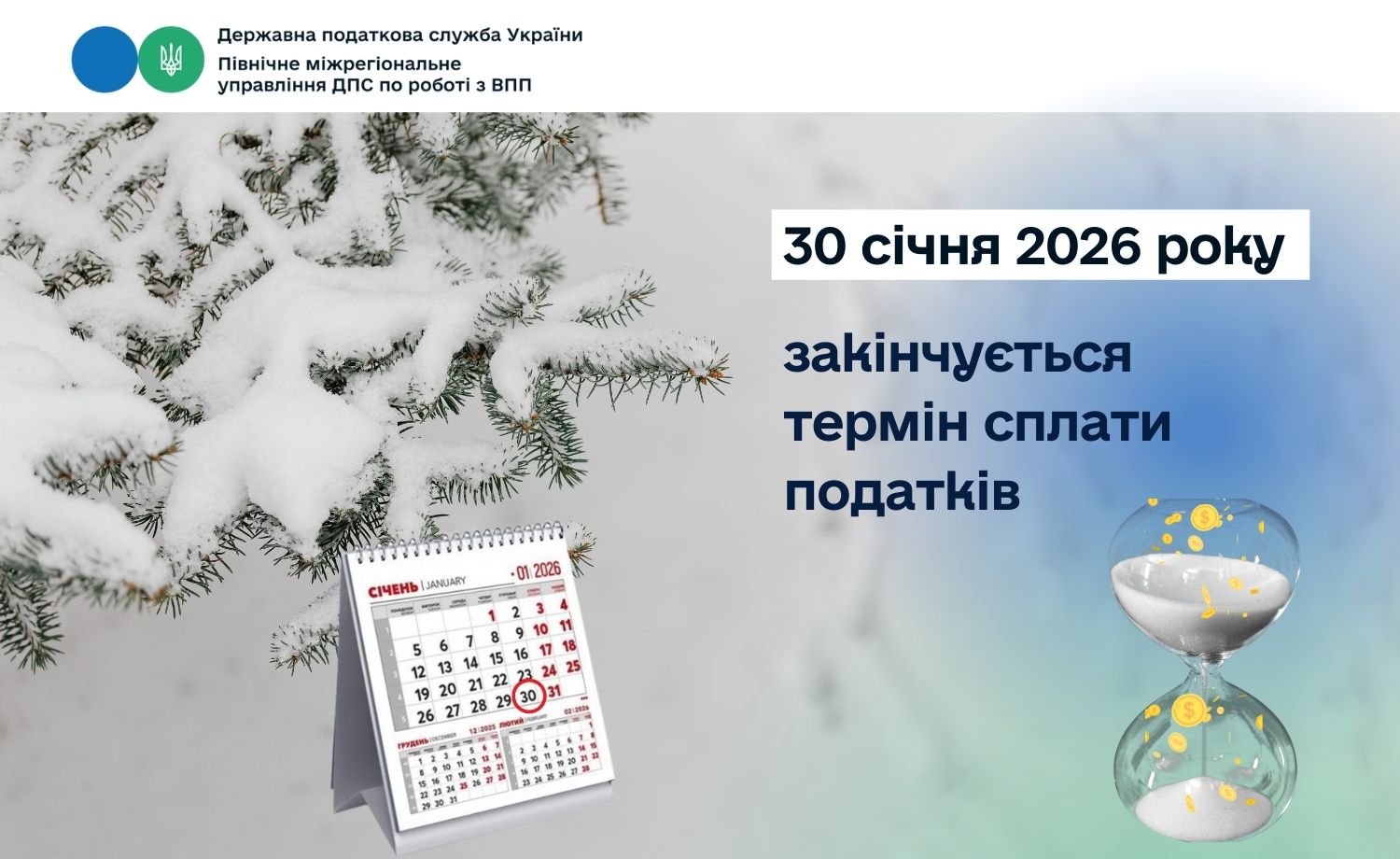 Північне міжрегіональне управління ДПС по роботі з великими платниками податків нагадує що 30 січня – останній день сплати за грудень 2025 року: