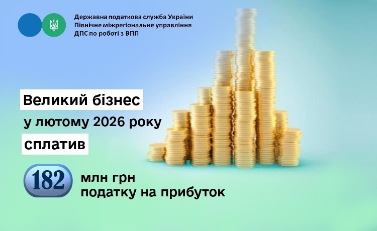 Протягом лютого 2026 року підприємства, які знаходяться на податковому обслуговуванні в Північному міжрегіональному управлінні ДПС по роботі з великими платниками податків, перерахували до державного бюджету 182 млн гривень податку на прибуток підприємств.
