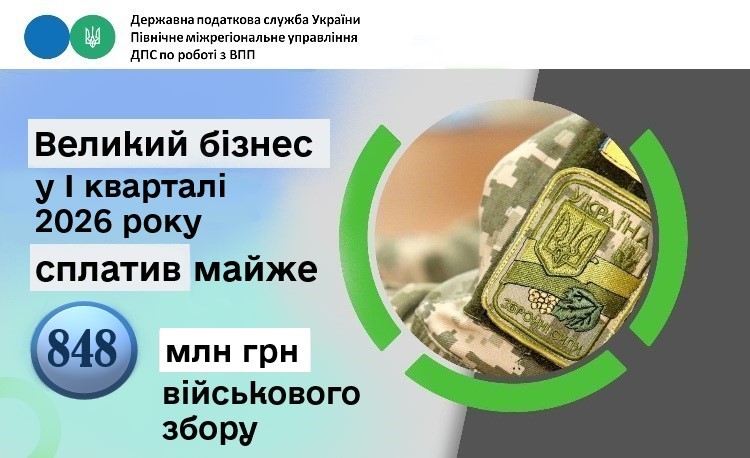 За три місяці 2026 року платники, які знаходяться на обслуговуванні в Північному міжрегіональному управлінні ДПС по роботі з великими платниками податків, сплатили до Державного бюджету 847,8 млн гривень військового збору.